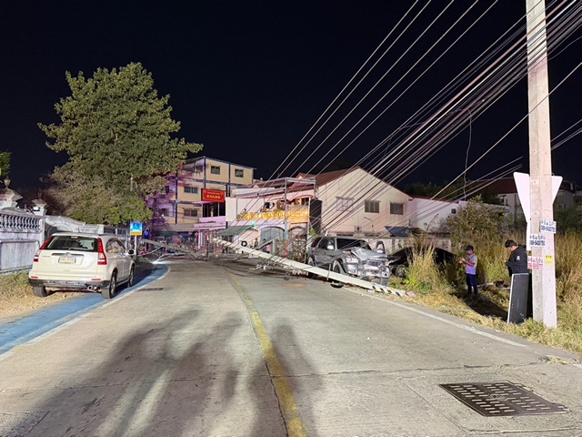 เมื่อเวลา 22.36 น.วันที่ 11 ม.ค.69 พ.ต.ต.ชานันท์ เกษรบัว รอง สว.สอบสวน สภ.เมืองพัทยา รับแจ้งอุบัติเหตุรถยนต์เสียหลักหลุดโค้งชนเสาไฟฟ้า หักโคนขวางถนน เหตุเกิดภายในซอยเพนียดช้าง ปากซอย 2 เมืองพัทยา ต.หนองปรือ อ.บางละมุง จ.ชลบุรี หลังรับแจ้งจึงประสานเจ้าหน้าที่การไฟฟ้าเมืองพัทยา เจ้าหน้าที่กู้ภัยสว่างบริบูรณ์ตามสถานเมืองพัทยา รีบนำกำลังไปตรวจสอบ
