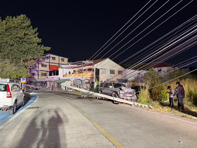 พัทยา ปิ๊กอัพหลุดโค้งชนเสาไฟฟ้าหักโค่น 3 ต้น ขวางถนน จราจรอัมพาต