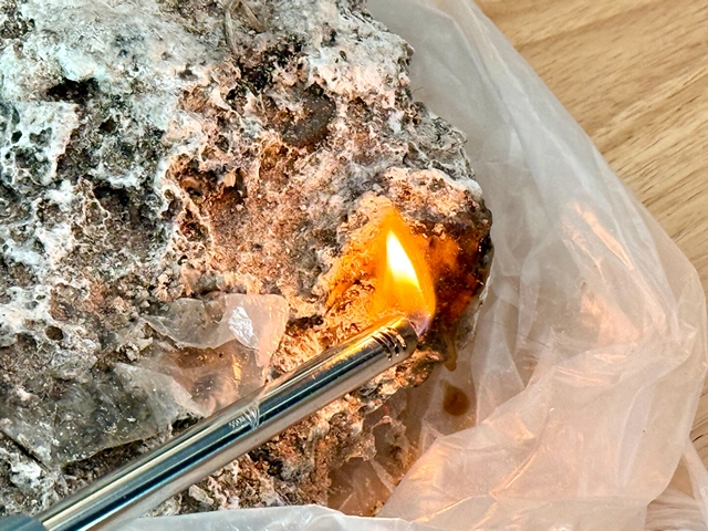 นายอานนท์ เจ้าของร้าน เล่าว่า เมื่อช่วงบ่ายวันที่ 11 มกราคม 2569 ขณะเดินเก็บเศษขยะที่ลอยมาเกยตื้นบริเวณชายหาดหน้าร้าน พบก้อนไขมันดังกล่าวเกยอยู่ริมฝั่ง มีนกกำลังรุมจิกกิน ด้วยความเข้าใจว่าอาจเป็นก้อนปะการังหรือเศษวัสดุธรรมชาติ จึงหยิบขึ้นมาดูและโยนกลับลงทะเลไป กระทั่งช่วงค่ำก้อนดังกล่าวกลับมาเกยตื้นที่จุดเดิมอีกครั้ง ตนจึงเก็บขึ้นมาตรวจดูอย่างละเอียด และทดลองใช้ไฟรน พบมีของเหลวสีเหลืองคล้าย “น้ำตาเทียน” ไหลออกมา เนื้อสัมผัสลื่นมัน ไม่มีกลิ่นเหม็น มีเพียงกลิ่นคาวทะเล จึงเกิดความสงสัยว่าอาจเป็น “อำพันทะเล” และกังวลว่าอาจเกี่ยวข้องกับของเสีย จึงประสานเมืองพัทยาให้เข้ามาตรวจสอบ