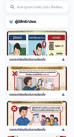 และเพื่อเป็นการให้ความรู้ประชาชนในการปฏิบัติตนที่ถูกต้องในการลงคะแนนเลือกตั้ง แอปพลิเคชัน “POLICE CARE” ได้เพิ่มเติมการอัปเดตบริการ “ข้อมูลกฎหมายเลือกตั้ง” โดยเน้นความผิดที่เกี่ยวข้องกับประชาชนและพบการกระทำความผิดบ่อยครั้ง เช่น ความผิดฐานนำบัตรออกจากสถานที่เลือกตั้ง ถ่ายภาพ ทำลาย ขายเสียง ฯลฯ จัดเรียงข้อมูลฐานความผิดเป็นหมวดหมู่ เพิ่มความสะดวกให้ประชาชนในการใช้งาน