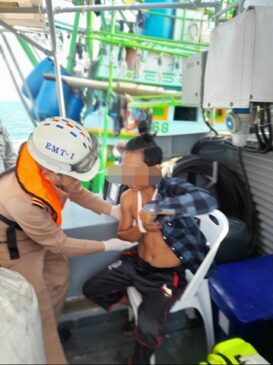 ทัพเรือภาคที่ 1 บูรณาการร่วม ศรชล.ภาค 1 ส่งเรือ ต.264 พร้อมชุดแพทย์ฉุกเฉิน ช่วยเหลือลูกเรือประมงต่างสัญชาติบาดเจ็บสาหัสกลางทะเลสัตหีบ