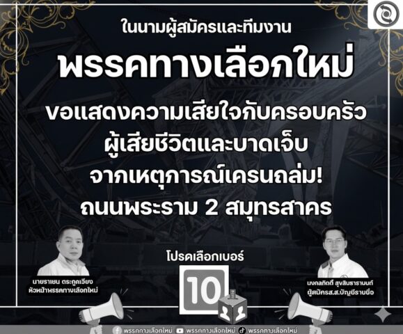 พรรคทางเลือกใหม่ แสดงความเสียใจต่อเหตุเครนก่อสร้างถล่ม บริเวณถนนพระราม 2 จังหวัดสมุทรสาคร