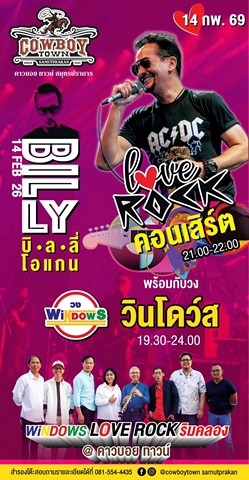 เชิญชวนพี่น้องชาวสมุทรปราการ และพี่น้องชาว Cowboy พบกับ LOVE ROCK บรรยากาศริมคลอง ค่ำคืนแห่งบทเพลงรักสายร็อคที่คุณคิดถึง จะกลับมาอีกครั้ง! ณ ร้าน Cowboy Town ฝั่งปั้มน้ำมัน PTT PARKMALL ถนนหลังวัดหนามแดง สมุทรปราการ