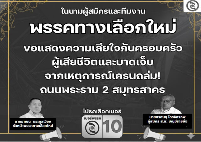 พรรคทางเลือกใหม่ แสดงความเสียใจต่อเหตุเครนก่อสร้างถล่ม บริเวณถนนพระราม 2 จังหวัดสมุทรสาคร