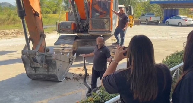 นครนายก พนักงาน อบต.ปรับภูมิทัศน์เตรียมจัดงานพบงูหลามตัวใหญ่นอนขดตัวใช้รถเครื่องยนต์หนักตักงูวัดได้ 3 เมตร น้ำหนัก 25 กิโลกรัม ป้ายทะเบียนรถ ต ค1416 นครนายก ส่องป้ายรถใกล้วันหวยออก