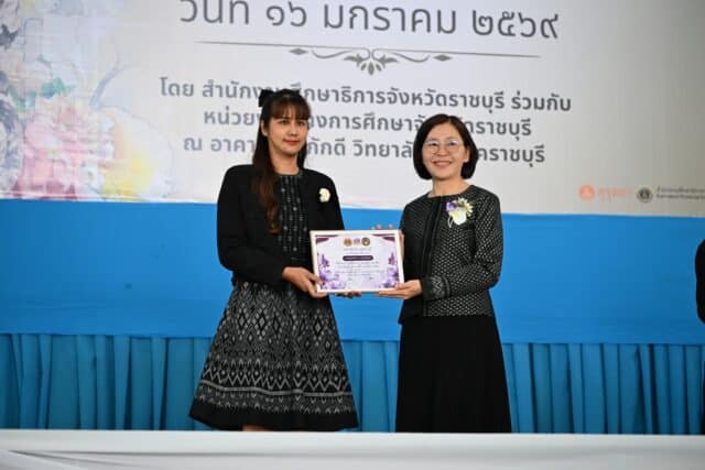 โอกาสนี้ ผู้ว่าราชการจังหวัดราชบุรี ได้ให้เกียรติมอบเกียรติบัตรยกย่องเชิดชูเกียรติแก่ครูและบุคลากรทางการศึกษาที่มีผลงานดีเด่น เพื่อเป็นขวัญและกำลังใจในการปฏิบัติหน้าที่พัฒนาเยาวชนของชาติต่อไป