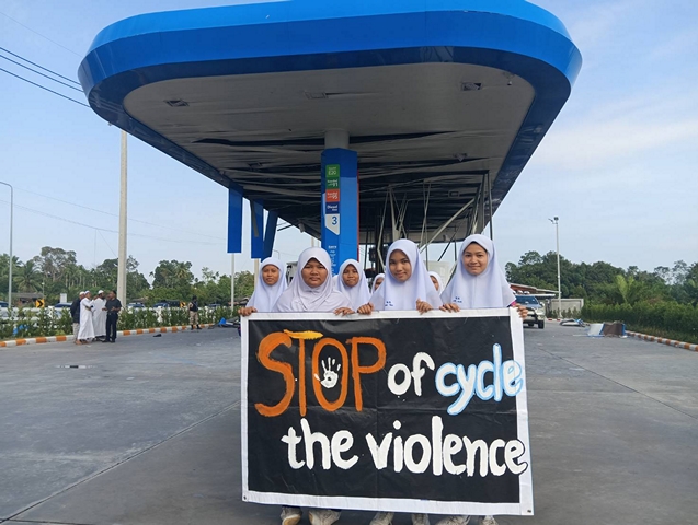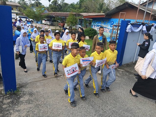 นราธิวาส-“หยุดสักที” นักเรียนจับมือผู้นำเดินขบวนต่อต้าน ยุติความรุนแรง ขอความสงบในพื้นที่แผ่นดินไทย