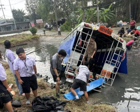 ปทุมธานี-สลดหลังฝนตกถนนลื่นรถสองแถวรับส่งนักเรียนเสียหลักพุ่งลงคลองนักเรียนต่างพากันหนีตายวุ่น บาดเจ็บ 5 ราย โชคดีไม่มีผู้้เสียชีวิต