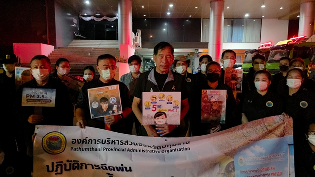 ที่ สำนักงานองค์การบริหารส่วนจังหวัดปทุมธานี พลตำรวจโท คำรณวิทย์ ธูปกระจ่าง นายกองค์การบริหารส่วนจังหวัดปทุมธานี นำทีมเจ้าหน้าที่ อบจ. ปล่อยแถวรณรงค์มาตรการป้องกันฝุ่นละอองขนาดเล็ก (PM 2.5) หลังพบว่าหลายพื้นที่ได้รับผลกระทบจากกลุ่มควันและฝุ่นละอองที่สะสมตัวหนาแน่น โดยหลายพื้นที่ที่ตรวจพบค่าฝุ่นพุ่งสูงเกินมาตรฐาน เกินระดับ 70 ไมโครกรัมต่อลูกบาศก์เมตร อำเภอคลองหลวง