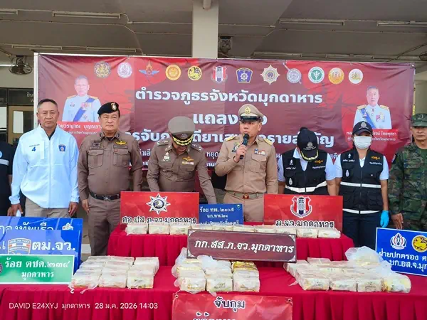 เมื่อวันที่ 28 มกราคม 2569 ที่กองบังคับการตำรวจภูธรจังหวัดมุกดาหาร นายวรญาณ บุญณราช ผู้ว่าราชการจังหวัดมุกดาหาร พร้อมด้วย พล.ต.ต.ไพโรจน์ ไทยพุทรา ผู้บังคับการตำรวจภูธรจังหวัดมุกดาหาร และ พ.ต.อ.ณภัทรพงศ์ สมใจ รองผู้บังคับการตำรวจภูธรจังหวัดมุกดาหาร ร่วมแถลงข่าวผลการจับกุมเครือข่ายค้ายาเสพติดรายใหญ่ในพื้นที่จังหวัดมุกดาหาร หลังเจ้าหน้าที่สามารถจับกุมผู้ต้องหาได้ 4 คน พร้อมตรวจยึดยาเสพติดให้โทษประเภท 1 (ยาไอซ์) น้ำหนักรวม 50 กิโลกรัม และอายัดทรัพย์สินที่เกี่ยวข้องกับการกระทำความผิดรวม 11 รายการ เป็นรถยนต์ 7 คัน รถจักรยานยนต์ 4 คัน รวมมูลค่าประมาณ 6,035,000 บาท