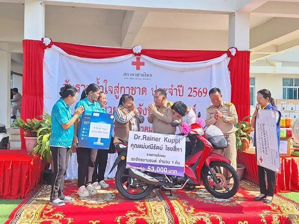ทั้งนี้ เพื่อระดมสิ่งของ นำไปมอบให้กับร้านมัจฉากาชาด และเป็นรางวัลให้กับพี่น้องประชาชน ที่มาเที่ยวชมงาน ได้ร่วมลุ้นโชค นำรายได้ช่วยเหลือพี่น้องประชาชน กลุ่มเปราะบาง และผู้ประสบสาธารณภัยต่อไป โดยสิ่งของ เงินสด ที่ได้รับบริจาค จะไดนำไปสมทบกับทุกอำเภอและภาคส่วนต่างๆ ในวันที่ 5 ก.พ.69 ที่จวนผู้ว่าฯกาฬสินธุ์ต่อไป ด้านนางมณีรัตน์ ไชยสีหา อายุ 59 ปี ผู้ประกอบการร้านมุณีเซ็นเตอร์ และผู้ผลิตน้ำดื่ม “น้ำมณี” กล่าวว่า ตนและ ดร.ไรเนอร์ คุ๊ปปี้ สามีชาวเยอรมัน ชอบช่วยเหลือสังคม และมีส่วนร่วมกับทางรายการ องค์กรปกครองส่วนท้องถิ่น สถานศึกษา วัด รวมทั้งองค์กรต่างๆ มาอย่างต่อเนื่อง เช่น ที่ผ่านมาบริจาคสมทบทุนสร้างกุฐิวัดหลายแห่ง ปรับภูมิทัศน์บริเวณพระธาตุพนมจำลองห้วยเม็ก มอบทุนสนับสนุนกิจกรรมตำรวจ มอบทุนการศึกษา บริจาคซื้อครุภัณฑ์ทางแพทย์ รพ.ห้วยเม็ก เป็นต้น นางมณีรัตน์กล่าวอีกว่า ในวันรวมน้ำใจสู่กาชาดฯครั้งนี้ เพื่อการมีส่วนร่วมในการดูแลสังคมกับทาง อ.ห้วยเม็ก และ จ.กาฬสินธุ์ ซึ่งถือเป็นการตอบแทนคุณแผ่นดินเกิด อีกครั้งหนึ่ง จึงได้ร่วมบริจาคสิ่งของ คือรถจักรยานยนต์ 1 คัน มูลค่า 53,000 บาท เพื่อเป็นของรางวัลร้านมัจฉากาชาด ในการจัดงานมหกรรมโปงลาง แพรวา และงานกาชาด จ.กาฬสินธุ์ดังกล่าว