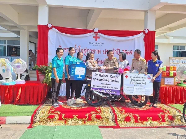 ทั้งนี้ เพื่อระดมสิ่งของ นำไปมอบให้กับร้านมัจฉากาชาด และเป็นรางวัลให้กับพี่น้องประชาชน ที่มาเที่ยวชมงาน ได้ร่วมลุ้นโชค นำรายได้ช่วยเหลือพี่น้องประชาชน กลุ่มเปราะบาง และผู้ประสบสาธารณภัยต่อไป โดยสิ่งของ เงินสด ที่ได้รับบริจาค จะไดนำไปสมทบกับทุกอำเภอและภาคส่วนต่างๆ ในวันที่ 5 ก.พ.69 ที่จวนผู้ว่าฯกาฬสินธุ์ต่อไป ด้านนางมณีรัตน์ ไชยสีหา อายุ 59 ปี ผู้ประกอบการร้านมุณีเซ็นเตอร์ และผู้ผลิตน้ำดื่ม “น้ำมณี” กล่าวว่า ตนและ ดร.ไรเนอร์ คุ๊ปปี้ สามีชาวเยอรมัน ชอบช่วยเหลือสังคม และมีส่วนร่วมกับทางรายการ องค์กรปกครองส่วนท้องถิ่น สถานศึกษา วัด รวมทั้งองค์กรต่างๆ มาอย่างต่อเนื่อง เช่น ที่ผ่านมาบริจาคสมทบทุนสร้างกุฐิวัดหลายแห่ง ปรับภูมิทัศน์บริเวณพระธาตุพนมจำลองห้วยเม็ก มอบทุนสนับสนุนกิจกรรมตำรวจ มอบทุนการศึกษา บริจาคซื้อครุภัณฑ์ทางแพทย์ รพ.ห้วยเม็ก เป็นต้น นางมณีรัตน์กล่าวอีกว่า ในวันรวมน้ำใจสู่กาชาดฯครั้งนี้ เพื่อการมีส่วนร่วมในการดูแลสังคมกับทาง อ.ห้วยเม็ก และ จ.กาฬสินธุ์ ซึ่งถือเป็นการตอบแทนคุณแผ่นดินเกิด อีกครั้งหนึ่ง จึงได้ร่วมบริจาคสิ่งของ คือรถจักรยานยนต์ 1 คัน มูลค่า 53,000 บาท เพื่อเป็นของรางวัลร้านมัจฉากาชาด ในการจัดงานมหกรรมโปงลาง แพรวา และงานกาชาด จ.กาฬสินธุ์ดังกล่าว
