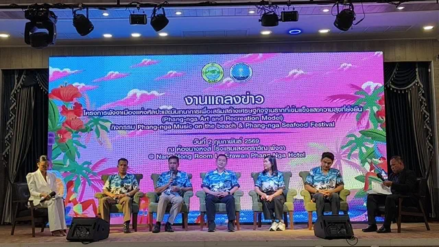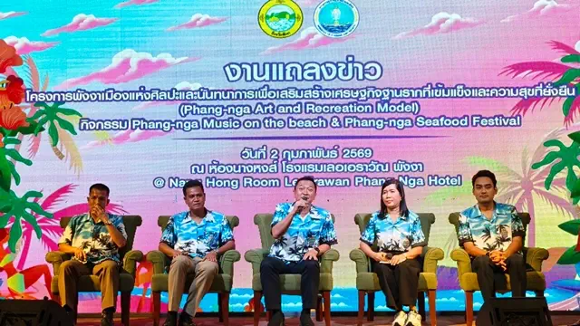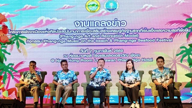 เมื่อวันที่ 2 ก.พ. 69 ผู้สื่อข่าวรายงานว่า ณ ห้องประชุมนางหงส์ โรงแรมเลอเอราวัณ จังหวัดพังงา นายสราวุฒิ ธนาเจริญสกุล รองผู้ว่าราชการจังหวัดพังงา พร้อมด้วย นางพิศมัย วงศ์แก้ว ท่องเที่ยวและกีฬาจังหวัดพังงา นายดำรง ฉิมทับ นายอำเภอตะกั่วป่า พ.ต.อ.สราวุธ ชูประสิทธิ์ รองผู้บังคับการตำรวจภูธรจังหวัดพังงา และนายเลิศศักดิ์ ปนกลิ่น นายกสมาคมธุรกิจการท่องเที่ยวจังหวัดพังงา ร่วมแถลงข่าวต่อสื่อมวลชน เตรียมจัดงาน “Phangnga Music on The Beach & Phangnga Seafood Festival”