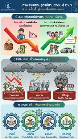 สรุปภาวะเศรษฐกิจอีสานล่าสุด โตสั้นๆ แต่เปราะบาง Q4/68 คนใช้จ่ายเยอะขึ้นเพราะมาตรการรัฐ + เที่ยวปีใหม่ แต่เป็นแค่ช่วงสั้นๆ คนรากหญ้า ยังลำบาก ความเชื่อมั่นน้อยลงเรื่อยๆส่วนเกษตรกร กระเป๋าแฟบ เพราะราคาผลผลิตตกต่ำและปริมาณลด ปี 69: แบงก์ชาติเตือน “น่าเป็นห่วง” เพราะแรงหนุนจากรัฐจะหมดลง แถมแรงงานลดลงทั้งในไร่นาและโรงงาน.