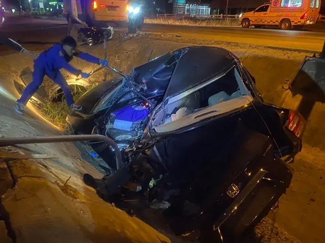 ร้อยเอ็ด…หนุ่มมือกลองควบเก๋งเสียหลักหมุนชนเสาไฟตกร่องกลางถนนดับคาที่