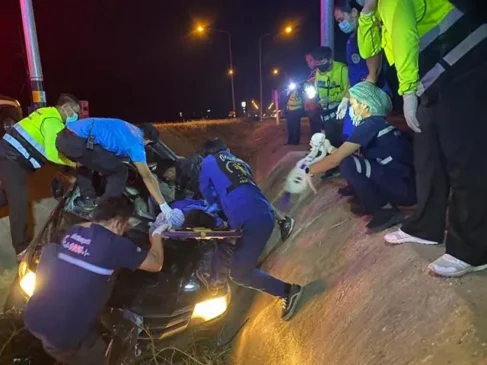 ร้อยเอ็ด…หนุ่มมือกลองควบเก๋งเสียหลักหมุนชนเสาไฟตกร่องกลางถนนดับคาที่