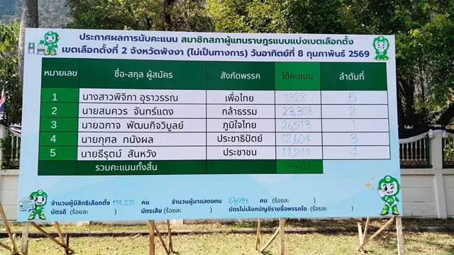 เมื่อวันที่ 9 ก.พ. 69 ผู้สื่อข่าวรายงานว่า ผลการนับคะแนนเลือกตั้งสมาชิกสภาผู้แทนราษฎรแบบแบ่งเขตและผลประชามติอย่างไม่เป็นทางการในจังหวัดพังงา ซึ่งพรรคภูมิใจไทยสามารถคว้าชัยชนะไปได้ทั้ง 2 เขตเลือกตั้ง ส่วนคะแนนแบบบัญชีรายชื่อ พรรคประชาธิปัตย์นำเป็นอันดับหนึ่ง ขณะที่ผลการออกเสียงประชามติเสียงส่วนใหญ่ไม่เห็นชอบ อย่างไรก็ตาม ในเขตเลือกตั้งที่ 1 จังหวัดพังงา ซึ่งประกอบด้วยอำเภอเมืองพังงา ตะกั่วทุ่ง ทับปุด และเกาะยาว นายอรรถพล ไตรศรี ผู้สมัครเบอร์ 5 จากพรรคภูมิใจไทย ได้รับคะแนนสูงสุด 36,274 คะแนน สำหรับเขตเลือกตั้งที่ 2