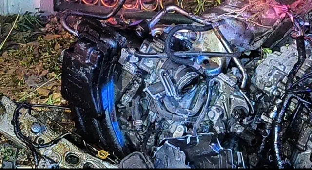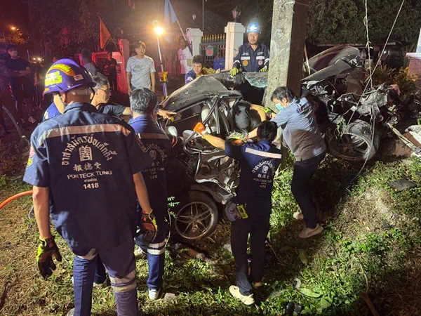 นครนายก เก๋งเสียหลักหลุดโค้งชนเสาไฟเครื่องยนต์กระเด็นคนขับเสียชีวิตคาที่ในซากรถ