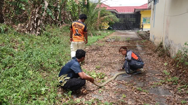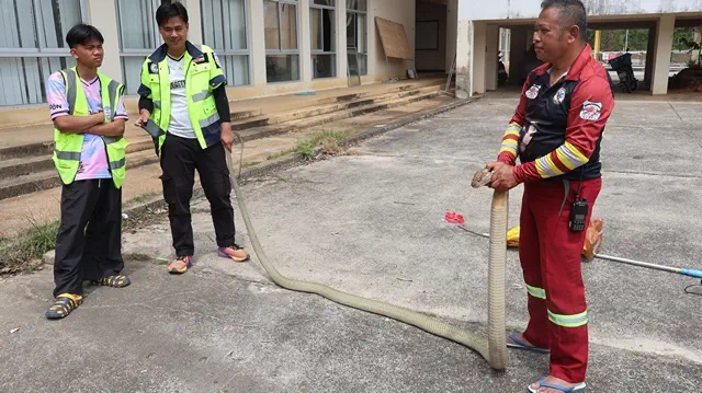 วันที่ 14 ก.พ.69 อาสาสมัครกู้ชีพกู้ภัยมูลนิธิอำเภอเบตง ได้รับแจ้งจาก อาสาสมัครรักษาดินแดนอำเภอเบตง ประจำจุดตรวจป้อมปราบ ว่า มีงูจงอางตัวใหญ่ อยู่บริเวณป่าหญ้าด้านหลังอาคารกองการศึกษาเก่า เทศบาลเมืองเบตง อ.เบตง จ.ยะลา กำลังเลื้อยไปที่บริเวณศูนย์พัฒนาเด็กเล็กเทศบาลเมืองเบตง ซึ่งอยู่ติดกัน จึงรีบนำอุปกรณ์การจับงูไป พร้อม น.ส.พัชรรินทร์ ประทุมเมฆ ประธานชมรมคนรักสัตว์บตง สมาชิกชมรมคนรักสัตว์บตง และอาสาสมัครกู้ชีพกู้ภัยมุสลิมเบตง
