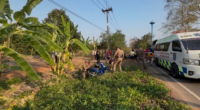 ในที่เกิดเหตุ สภาพเป็น คูข้างทางถนนติดกับสวนทุเรียน ในเขตพื้นที่หมู่ที่ 6 ตำบลช้างข้าม อำเภอนายายอาม จังหวัดจันทบุรี พบรถมอเตอร์ไซค์ฮอนด้าเวฟสีนำเงิน นอนตะแคงอยู่ในคูน้ำข้างทาง ลึกประมาณ2 ถึง 3 เมตร