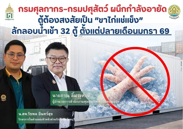 กรมศุลกากร–กรมปศุสัตว์ ผนึกกำลังอายัดตู้ต้องสงสัยเป็น “ขาไก่แช่แข็ง” ลักลอบนำเข้า 32 ตู้ ตั้งแต่ ปลายเดือนมกรา 69