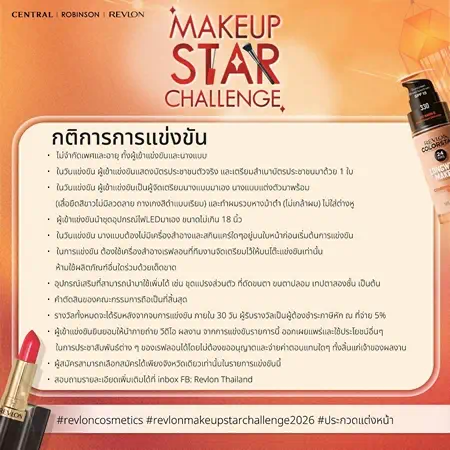 เครื่องสำอาง Revlon ร่วมกับ ห้างสรรพสินค้าเซ็นทรัล และ โรบินสัน จัดกิจกรรม Revlon Makeup Star Challenge ประจำภาคเหนือ เชิญชวนผู้ที่รักการแต่งหน้าและมีใจพร้อมพิสูจน์ความสามารถ เข้าร่วมประกวดเพื่อคัดเลือกตัวแทนจังหวัด จังหวัดละ 5 คน จาก 5 จังหวัดภาคเหนือ สู่การแข่งขันรอบชิงชนะเลิศ ชิงเงินรางวัลและผลิตภัณฑ์รวมมูลค่าสูงสุดกว่า 50,000 บาท พร้อมโอกาสแสดงศักยภาพบนเวทีระดับภูมิภาค