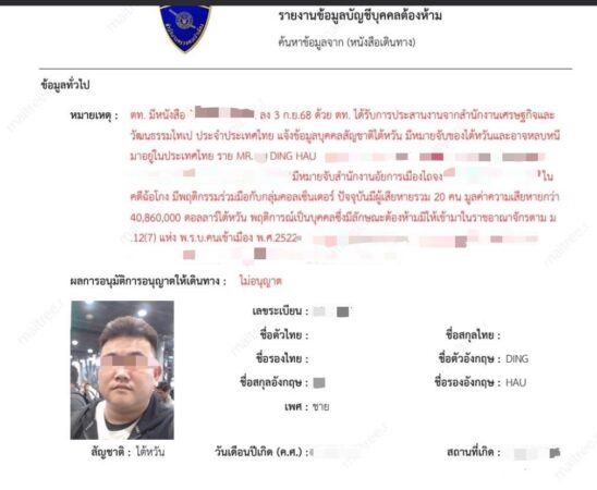 สืบเนื่องจาก เมื่อวันที่ 3 ก.ย.68 กองการต่างประเทศ สำนักงานตำรวจแห่งชาติ ได้รับการประสานงานจากสำนักงานเศรษฐกิจและวัฒนธรรมไทเป ประจำประเทศไทย แจ้งข้อมูลบุคคลมีหมายจับของไต้หวันและอาจหลบหนีมาอยู่ในประเทศไทย