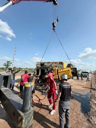 ที่เกิดเหตุ พบรถบดถนนแบบ 6 ล้อยาง สีเหลือง พลิกคว่ำอยู่บริเวณข้างทางซึ่งมีน้ำท่วมขังสูงประมาณ 60 เซนติเมตร ใต้ตัวรถพบร่างผู้ขับขี่เสียชีวิตคาที่ เจ้าหน้าที่อาสาสมัครกู้ภัยนครสาเกตุ การกุศล จังหวัดร้อยเอ็ด พยายามให้การช่วยเหลืองัดร่างผู้เสียชีวิตออกจากตัวรถอย่างเต็มที่