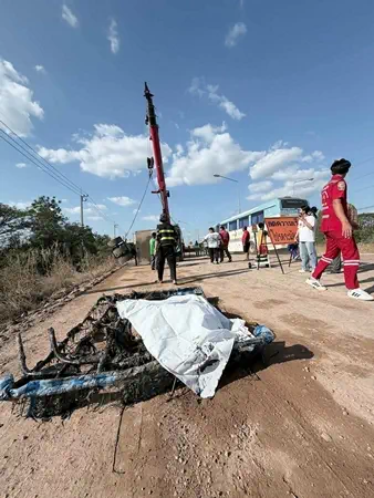 ก่อนเจ้าหน้าที่ตำรวจจะประสานรถเครนยกรถบดที่ประสบเหตุขึ้นจากจุดเกิดเหตุอย่างทุลักทุเลท่ามกลางไทยมุงจำนวนมาก และเจ้าหน้าที่กู้ภัยฯได้ใช้เครื่องมือพิเศษฯนำร่างผู้เสียชีวิตออกมาจากตัวรถได้โดยใช้เวลาประมาณ 1 ชั่วโมงจึงแล้วเสร็จจบภาระกิจ ผู้เสียชีวิตทราบชื่อในเวลาต่อมาคือ นายโภควินทร์ อายุ 19 ปี เป็นชาวจังหวัดเลย