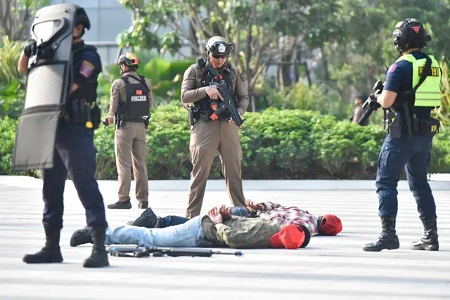 วันนี้ (20 กุมภาพันธ์ 2569) เวลา 08.00 น. พล.ต.อ.กิตติ์รัฐ พันธุ์เพ็ชร์ ผู้บัญชาการตำรวจแห่งชาติ (ผบ.ตร.) เป็นประธานการซักซ้อมแผนเผชิญเหตุกราดยิงของเจ้าหน้าที่ตำรวจและตอบสนองเหตุการณ์ภาคประชาชน ของกองบัญชาการตำรวจนครบาล โดยมี พล.ต.อ.ธัชชัย ปิตะนีละบุตร รอง ผบ.ตร., พล.ต.ท.สุรพงษ์ ถนอมจิตร ผู้ช่วย ผบ.ตร., พล.ต.ท.กฤษฎา กาญจนอลงกรณ์ ผู้ช่วย ผบ.ตร., พล.ต.ท.สยาม บุญสม ผู้บัญชาการตำรวจนครบาล (ผบช.น.), พล.ต.ต.ชรินทร์ โกพัฒน์ตา รอง ผบช.น., พล.ต.ต.ชัยพัชร์ ศรีประเสริฐ รอง ผบช.น. พร้อมด้วยผู้บังคับการตำรวจนครบาล 1–9, กองบังคับการสายตรวจและปฏิบัติการพิเศษ, กองบังคับการอำนวยการ, รองผู้บังคับการตำรวจนครบาล 1–9 (ฝ่ายป้องกันปราบปราม), ผู้แทนจากสำนักงานยุทธศาสตร์ตำรวจ, ผู้สังเกตการณ์จากฝ่ายรักษาความปลอดภัย World Bank/IMFและผู้สังเกตการณ์จากกระทรวงการคลัง เข้าร่วมสังเกตการณ์การซักซ้อมแผนเผชิญเหตุ ณ ห้างสรรพสินค้าวันแบงค็อก (One Bangkok)