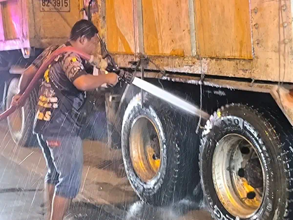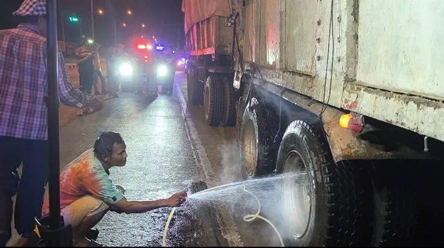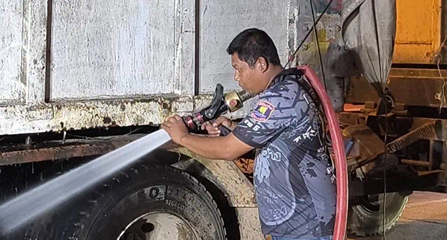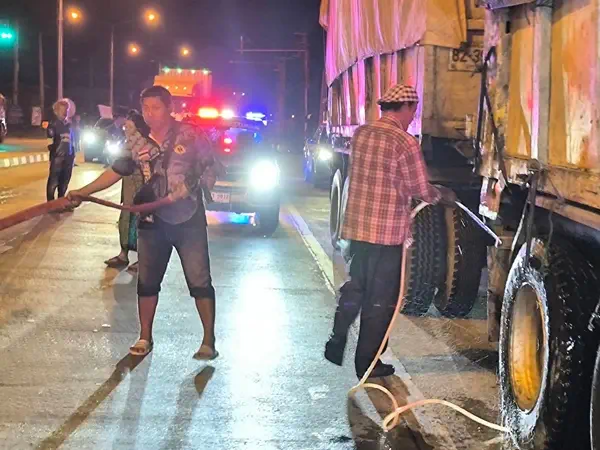 ควันไฟกำลังพวยพุ่งออกมาจากล้อรถข้างขวาของรถพ่วงตัวแม่ได้มีขาวบ้าน และกู้ภัยฯใช้สายยางฉีดน้ำไปที่รถพ่วงล้อหลังต่อมาได้มีรถดับเพลิงจากองค์การบริหารส่วนตำบลพรหมณี มาช่วยดับไฟ 1 คันใช้เวลา ประมาณ 10 นาที่ควันไฟจึงสงบลง แต่ควันไฟได้ย้ายไปลุกไหม้ที่ล้อหลังด้านซ้ายอีกฝั่งทำให้มีควันไฟพวยพุ่งออกมาอีก เจ้าหน้าที่จึงได้ย้ายมาฉีดทำให้ควันไฟเริ่มสงบลง