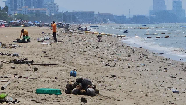 ชลบุรี-ขยะเกลื่อนชายหาดจอมเทียนหลาย กม. นักท่องเที่ยวผวา ไม่กล้าลงเล่นน้ำ เมืองพัทยาเร่งเก็บกวาดด่วน