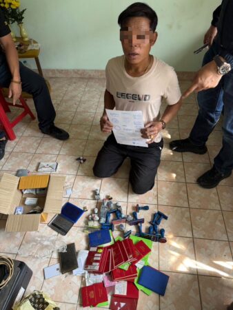 หนังสือเดินทางปลอม จากการลงพื้นที่สืบสวนนานกว่า 4 เดือน จึงทราบว่าบ้านเช่าทั้ง 2 หลัง คือบ้านเลขที่ 114/xxx และบ้านเลขที่ 49/xx ต.บางรักพัฒนา อ.บางบัวทอง จ.นนทบุรี ซึ่งห่างกันประมาณ 2 กม. จนท.ชุดจับกุม จึงได้วางแผนเฝ้าสังเกตบ้านทั้ง 2 หลัง จนกระทั่งเมื่อวันที่ 20 ก.พ.2569 จนท.ชุดจับกุม พบ นายมิน หรือ นายปิน (นามสมมุติ) ออกมาจากบ้านพักเลขที่ 114/xxx จนท.ชุดจับกุม จึงได้แสดงตัวเข้าจับกุมแสดงหมายจับศาลจังหวัดสงขลา นายมิน หรือ นายปิน (นามสมมุติ) ยอมรับว่าเป็นบุคคลเดียวกันกับหมายจับ และนำ จนท.ชุดจับกุม ตรวจค้นภายในบ้านพักดังกล่าว พบ อุปกรณ์การทำหนังสือเดินทาง จำนวน 66 รายการ อาทิ เช่น เครื่องคอมพิวเตอร์ โน้ตบุ๊ก จำนวน 2 เครื่อง, เครื่องพิมพ์, เครื่องเคลือบแผ่นลามิเนต, หนังสือเดินทางเมียนมา จำนวน 36 เล่ม, ตรายางประทับของ ตม.ต่างๆ ทั้งประเทศไทย และเมียนมา จำนวน 16 อัน พร้อมทั้งตรวจยึด รถยนต์กระบะ จำนวน 1 คัน, รถจักรยานยนต์, สมุดบัญชีธนาคาร จำนวน 3 เล่ม พบเงินหมุนเวียนมากกว่า 1 ล้านบาท รวมทรัพย์สินทั้งหมดกว่า 2 ล้านบาท