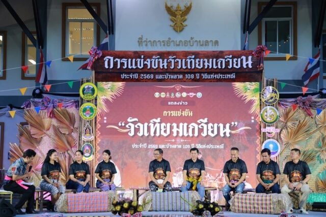 เมื่อเวลา 17.00 น.วันที่ 24 กุมภาพันธ์ ณ ที่ว่าการอำเภอบ้านลาด ร.ต.อ.ภพชนก ชลานุเคราะห์ ผวจ.เพชรบุรี เป็นประธานแถลงข่าวการจัดงาน”การแข่งขันวัวเทียมเกวียน ประจำปี 2569 และบ้านลาด 109 ปี” ซึ่งจังหวัดเพชรบุรี อำเภอบ้านลาด องค์การบริหารส่วนจังหวัดเพชรบุรีและองค์กรปกครองส่วนท้องถิ่น ในพื้นที่ ชมรมกำนัน ผู้ใหญ่บ้าน มีกำหนดจัดขึ้นในวันที่ 27 – 31 มีนาคม 2569 ณ ทุ่งถ้ำรงค์ หมู่ที่ 3 ตำบลถ้ำรงค์ อำเภอบ้านลาด จังหวัดเพชรบุรี โดยมี จ่าอากาศเอก อภิชาติ แก้วโกศล สส.เพชรบุรี เขต 3 พรรคภูมิใจไทย นางดวงใจ คุ้มสอาด ผอ.ททท.เพชรบุรี นางกัญญพัชร นางาม ดำรงตำแหน่งวัฒนธรรมจังหวัดเพชรบุรี นายปรีชา อนันต์วรนาถ นายอำเภอบ้านลาด นายประสงค์ หอมนาน นายก อบต.ท่าเสน ตัวแทนของผู้บริหารองค์กรปกครองส่วนท้องถิ่นในอำเภอบ้านลาด พร้อมหัวหน้าส่วนราชการ ร่วมแถลงข่าว และให้การต้อนรับ
