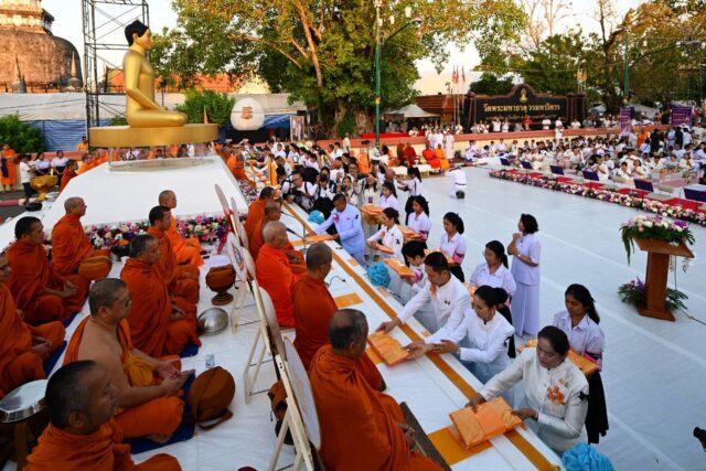 เมื่อเวลา 06.00 น. วันที่ 28 ก.พ. 2569 ที่ วัดพระมหาธาตุ วรมหาวิหาร จังหวัดนครศรีธรรมราช ได้มีการจัดพิธีตักบาตรมหากุศลครั้งยิ่งใหญ่ โดยมี พระเทพสิริวชิรเวที เจ้าคณะภาค 16 (ธรรมยุต) เป็นประธานฝ่ายสงฆ์ และ นายสมชาย ลีหล้าน้อย ผู้ว่าราชการจังหวัดนครศรีธรรมราช เป็นประธานฝ่ายฆราวาส ท่ามกลางหัวหน้าส่วนราชการ ภาคเอกชน และประชาชนที่พร้อมใจกันสวมชุดขาวเข้าร่วมพิธีจนเต็มพื้นที่ถนนราชดำเนินยาวต่อเนื่องไปจนถึงแยกหอนาฬิกา