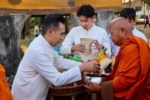 บิณฑบาตและได้นำสิ่งของเครื่องยังชีพไปมอบแก่ผู้ยากไร้ในพื้นที่ 6 ตำบลของอำเภอท่าหลวง