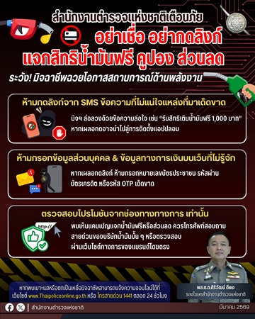วันนี้ (15 มีนาคม 2569) พล.ต.ต.ศิริวัฒน์ ดีพอ รองโฆษกสำนักงานตำรวจแห่งชาติ เปิดเผยว่า พล.ต.อ.กิตติ์รัฐ พันธุ์เพ็ชร์ ผู้บัญชาการตำรวจแห่งชาติ มีความห่วงใยพี่น้องประชาชนจากภัยคุกคามทางออนไลน์ ที่มิจฉาชีพฉวยโอกาสจากสถานการณ์ความขัดแย้งและสงครามในต่างประเทศ ซึ่งส่งผลกระทบต่อความกังวลเรื่องราคาพลังงาน โดยคนร้ายได้ส่งข้อความสั้น (SMS) หรือลงโฆษณาผ่านโซเชียลมีเดีย แอบอ้างเป็นบริษัทน้ำมันชื่อดังเพื่อแจกคูปองเติมน้ำมันฟรี หรือให้สิทธิ์ส่วนลดพิเศษ หลอกลวงให้ประชาชนกดลิงก์ปลอมและกรอกข้อมูลส่วนตัว นำไปสู่การติดตั้งแอปพลิเคชันปลอม จนได้รับความเสียหายเป็นจำนวนมาก