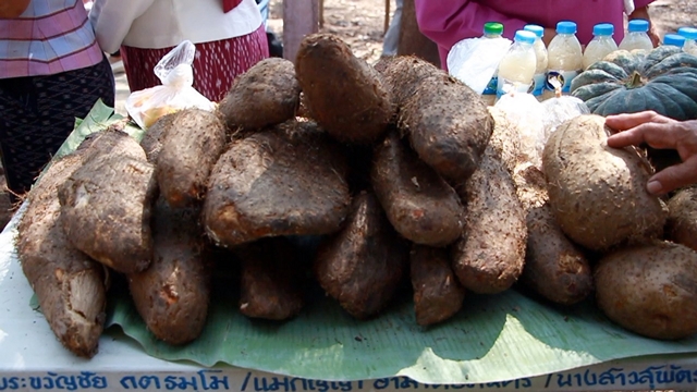 โดยภายในงานยังมีการนำสินค้าที่เป็นอาหารที่ชาวบ้านเก็บหาได้จากป่าชุมชนฯ มาวางจำหน่ายและให้ชิม เช่น กระบกคั่ว ไข่มดแดง มันมือเสือ รากสมุนไพรสำหรับดองยา รวมทั้งเมี่ยงข่า อาหารทานเล่นที่เกิดจากการนำเอาลำต้นของข่าและสมุนไพรต่าง ๆ ที่มีรสเผ็ดและมีสรรพคุณเป็นยามาตำเข้ากัน ปรุงรสด้วยมะนาว น้ำปลา และน้ำปลาร้า ทานคู่กับใบมะยมและลูกขนุนอ่อน โดยนายอำเภอน้ำพอง และเจ้าหน้าที่จากสำนักจัดการทรัพยากรป่าไม้ที่ 7 (ขอนแก่น) ได้ร่วมกันชิมและอุดหนุนชาวบ้านที่นำสินค้ามาจำหน่ายด้วย