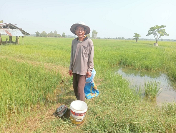 “เมื่อราคาปุ๋ยเคมีสูงขึ้น และไม่มั่นใจว่าจะได้ผลผลิตสูงดังกล่าว ตนและเพื่อนชาวนาหลายราย จึงได้ปรับลดปริมาณการใช้ปุ๋ยเคมีลง เพื่อประหยัดทุนทำนา จากที่เคยใช้ไร่ละ 1 ถุงหรือทั้งหมด 40 ถุง เหลือเพียง 17 ถุงเท่านั้น โดยใช้ปุ๋ยน้ำทางใบหรือฉีดพ่นฮอร์โมนทดแทน และจะหมั่นสำรวจว่าบริเวณใดที่ต้นข้าวเติบโตช้า หรือใบข้าวมีสีเหลือง เพราะรับสารอาหารไม่เพียงพอ จึงจะหว่านเม็ดปุ๋ยเคมีซ้ำ เพื่อให้ต้นข้าวได้แตกกอและออกรวงอย่างเต็มที่