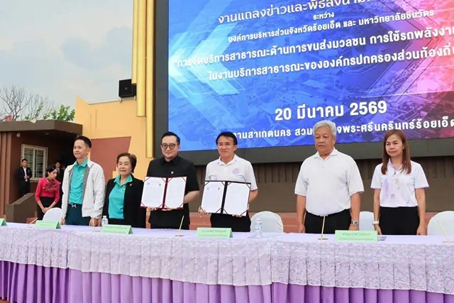 วันนี้( 20 มีนาคม 2569 ) เวลา 17.00 น. องค์การบริหารส่วนจังหวัดร้อยเอ็ด จัดงานแถลงข่าวพร้อมพิธีลงนามบันทึกความเข้าใจ (MOU) ร่วมกับมหาวิทยาลัยชินวัตร ภายใต้โครงการ “การจัดบริการสาธารณะด้านการขนส่งมวลชนด้วยรถพลังงานไฟฟ้า (EV)” ณ ลานสาเกต สวนสมเด็จพระศรีนครินทร์ร้อยเอ็ด