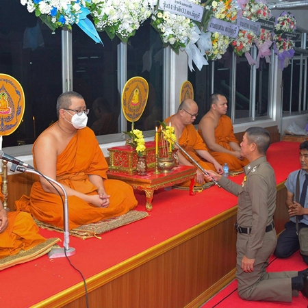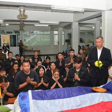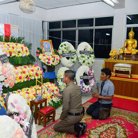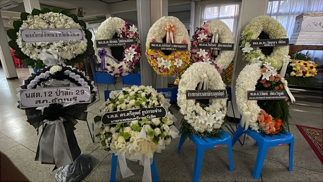 โดยมีนายตำรวจระดับผู้บังคับบัญชาตำรวจ พ.ต.อ.วิวัฒน์ อัศวะวิบูลย์ ผกก.สภ.เมืองปทุมธานี อดีตผกก.สภ.ธัญบุรี พ.ต.อ.จิรวัฒน์ เปี่ยมปิ่นเศรษฐ ผกก.สภ.อินทร์บุรี จ.สิงห์บุรี อดีต ผกก.สภ.ธัญบุรีโดยมีผู้บังคับบัญชาจัดพวงหรีดเพื่อเป็นการแสดงความเสียใจกับครอบครัวผู้เสียชีวิตประกอบด้วย พล.ต.ท.วัฒนา ยี่จีน ผบช.ภ.1 พล.ต.ต.อภิรักษ์ เวชกาญจนา รองผบช.ภ. ตำรวจ สภ.ธัญบุรี และรุ่นท14 ป่าสัก 31 สภ.ธัญบุรี และเพื่อนข้าราชการตำรวจสภ.ธัญบุรี พร้อมด้วย นายชุมพร กองอุดม อายุ 61 ปี บิดาของผู้เสียชีวิต และญาติร่วมพิธีรดน้ำศพบรรยากาศเป็นอย่างความเศร้าโศกเสียใจของเพื่อนข้าราชการตำรวจ