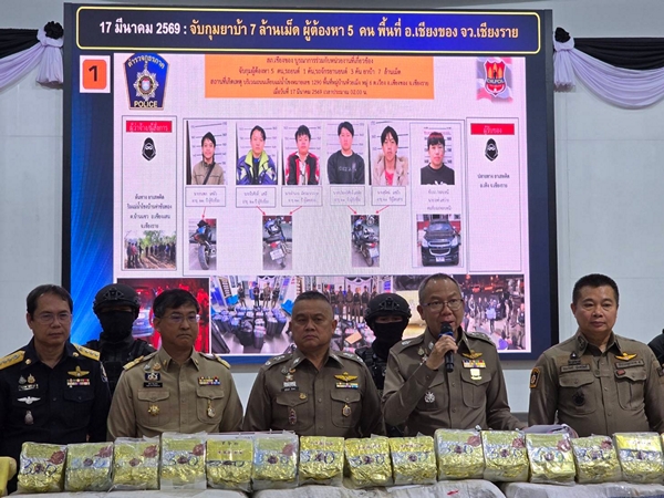 คดีที่ 1 หน่วยที่จับกุม สภ.เชียงของ จว.เชียงราย, ฝ่ายปกครอง, ฝ่ายทหาร ร่วมกับหน่วยงานที่เกี่ยวข้องเมื่อวันที่ 17 มี.ค.2569 เวลาประมาณ 02.00 น. เจ้าหน้าที่ตำรวจ สภ.เชียงของ จ.เชียงราย ได้ร่วมกันตั้งจุดตรวจที่บริเวณถนนหน้าวัดเทพนิมิต สายเชียงของ – เชียงแสน ต.เวียง อ.เชียงของ จ.เชียงราย ที่เกิดเหตุพบผู้ต้องหาที่ 1- 5ขับขี่รถจักรยานยนต์มา จำนวน 3 คัน จึงได้เรียกให้หยุดเพื่อตรวจค้น และขณะกำลังตรวจค้นมีรถยนต์อเนกประสงค์ ยี่ห้อเชฟโรเลท สีดำ ทะเบียน ชลบุรี ติดตามมา จึงได้เรียกให้หยุดแต่รถยนต์คันดังกล่าวไม่ยอมหยุดได้ขับขี่หลบหนีไป และได้ทิ้งรถห่างจากจุดตรวจประมาณ 800 เมตร ผู้ขับขี่รถยนต์ได้วิ่งหลบหนีไป ตรวจค้นภายในรถยนต์พบยาบ้า จำนวน 24 กระสอบ รวมประมาณ 7 ล้านเม็ด ซุกซ่อนอยู่ในรถ ซักถามขยายผล ผู้ต้องหาที่ 1 – 5 รับว่าใช้รถจักรยานยนต์นำ สำรวจเส้นทางรถยนต์
