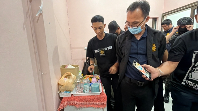 ภายในห้องพัก พบชายและหญิงกำลังมั่วสุม เจ้าหน้าที่จึงควบคุมตัวและตรวจค้นเพิ่มเติม พบยาบ้าอีกจำนวน 107 เม็ด ยาบ้าบดละเอียดบรรจุถุงพลาสติกใสจำนวนหนึ่ง และยาไอซ์อีก 5 ถุง น้ำหนักรวม 6.64 กรัม โดยผู้ต้องหาให้การรับสารภาพว่า กำลังนำยาเสพติดลงไปส่งให้เจ้าของยา แต่ถูกเจ้าหน้าที่ตรวจค้นเสียก่อน