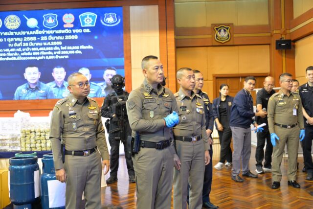 วันนี้ (26 มีนาคม 2569) เวลา 14.00 น. พล.ต.อ.กิตติ์รัฐ พันธุ์เพ็ชร์ ผู้บัญชาการตำรวจแห่งชาติ (ผบ.ตร.) เป็นประธานการแถลงผลการปฏิบัติปราบปรามเครือข่ายยาเสพติดของสำนักงานตำรวจแห่งชาติ (ห้วงวันที่ 1 ตุลาคม 2568 – 25 มีนาคม 2569) ที่กองบัญชาการตำรวจปราบปรามยาเสพติด (บช.ปส.) โดยมี พล.ต.อ.สำราญ นวลมา รอง ผบ.ตร./ผอ.ศอ.ปส.ตร., พล.ต.ท.อาชยน ไกรทอง ผบช.ปส., พล.ต.ท.สยาม บุญสม ผบช.น., พล.ต.ท.กฤตธาพล ยี่สาคร ผบช.ภ.5, พล.ต.ต.ธีรเดช ธรรมสุธีร์ รอง ผบช.น./รอง โฆษก ตร., ผู้แทน บช.ตชด., ผู้แทน สำนักงาน ป.ป.ส. และ ผู้แทน กอ.รมน. โดยบูรณาการทุกหน่วยที่เกี่ยวข้อง เพื่อ “ตัดต้นทาง–ตัดเส้นทาง–ตัดปลายทาง” พร้อมยึดทรัพย์เครือข่ายผู้กระทำผิดอย่างเป็นรูปธรรม