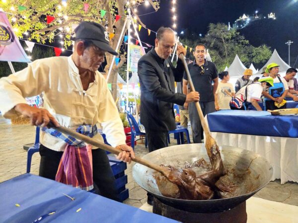 เมื่อวันที่ 28 มี.ค.69 ที่บริเวณสวนสาธารณะเฉลิมพระเกียรติ หน้าศาลากลางจังหวัดประจวบฯ นายสิทธิชัย สวัสดิ์แสน ผู้ว่าราชการ จ.ประจวบฯ เป็นประธานเปิดงาน “สามอ่าวเล่าขาน สืบสานประวัติศาสตร์ หลากหลายพหุวัฒนธรรม” ระหว่างวันที่ 27 – 29 มี.ค.69 มี พระเทพวชิรสุธี เจ้าคณะจังหวัดประจวบฯ (ธรรมยุต) เจ้าอาวาสวัดธรรมิการามวรวิหาร พระราชรัตนวิสุทธิ์ เจ้าคณะจังหวัดประจวบฯ (มหานิกาย) เจ้าอาวาสวัดกุยบุรี นายพงษ์พันธ์ เผ่าประทาน สส.เขต 3 จังหวัดประจวบฯ พรรคภูมิใจไทย นายสวาป เผ่าประทาน รองประธานคณะกรรมการกลางอิสลามแห่งประเทศไทย นายยูซบ โต๊ะวัง ประธานคณะกรรมการอิสลามประจำจังหวัดประจวบฯ นายสราวุธ ลิ้มอรุณรักษ์ นายกองค์การบริหารส่วนจังหวัดประจวบฯ ร้อยโทสิทธิชัย ตัณฑสิทธิ์ ท่องเที่ยวและกีฬาจังหวัดประจวบฯ รองผู้ว่าราชการ จ.ประจวบฯ หัวหน้าส่วนราชการ แขกผู้มีเกียรติ และประชาชนนักท่องเที่ยวจำนวนมากร่วมชมงาน พร้อมกันนี้ผู้ว่าราชการจังหวัดประจวบฯ ได้ร่วมกวนสับปะรด กล้วย กาละแม และกระยาสารท แจกให้ผู้ร่วมงานได้ลองชิมด้วยรองผู้ว่าราชการ