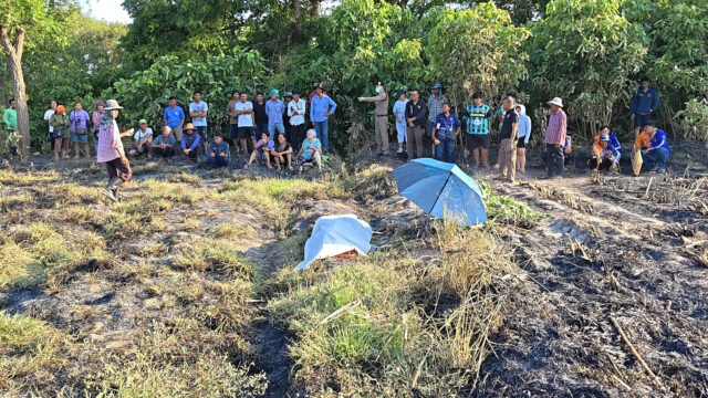 จากการสอบสวน นายประทีป พูลศิลป์ชัย เจ้าของไร่อ้อย คนที่ร่างผู้เสียชีวิตเล่าว่า ตนทำไร่อ้อยอยู่ใกล้ที่เกิดเหตุ เห็นไฟลุกไหม้อยู่ข้างไร่อ้อยตน จึงนำถังน้ำฉีดพ่นยาเดินออกมาดู กลัวไฟจะลามข้ามมาไหม้อ้อยตน จึงมาดู เมื่อมาถึงเห็นผู้ตายนอนตะแคงไฟไหม้เสื้อผ้าเสียชีวิตไปแล้ว จึงแจ้งตำรวจมาตรวจสอบ