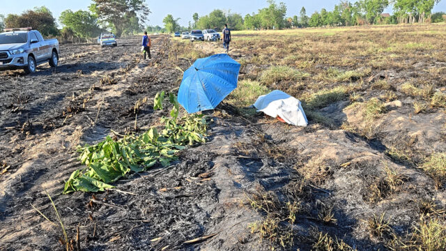 ในที่เกิดเหตุเป็นไร่อ้อย เนื้อที่ประมาณ 8 ไร่ พบร่าง คุณยายรัตติญา บุปผา อายุ 71 ปี มีผ้าขาวคลุมร่างเอาไว้ จากการตรวจสอบพบใบหน้าลำตัวแขนขา ถูกไฟคลอก ไหม้หลายเกือบทั่วร่างในมือขวากำกิ่งไม้กำไว้แน่น