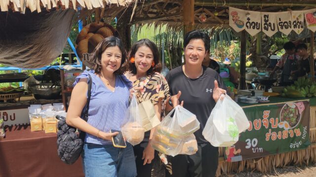 นอกจากความสวยงามของบรรยากาศแล้ว ภายในตลาดยังอัดแน่นไปด้วยของกินพื้นบ้านและผลผลิตจากสวนในราคาย่อมเยา ไม่ว่าจะเป็นสลัดโรล ผักปลอดสาร ข้าวโพดย่าง ข้าวเหนียวส้มตำ กล้วยแขก ลูกชิ้นปิ้ง ทับทิมกรอบ ข้าวต้มมัด และกะหรี่ปั๊บ รวมถึงเมนูไฮไลต์อย่างกุ้งแม่น้ำย่างสด ๆ ที่ส่งกลิ่นหอมชวนชิมไปทั่วบริเวณ