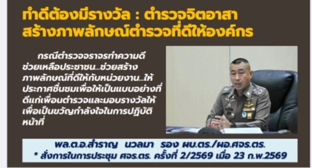 วันนี้ (30 มีนาคม 2569) เวลา 16.00 น. พล.ต.อ.สำราญ นวลมา รองผู้บัญชาการตำรวจแห่งชาติ ในฐานะผู้อำนวยการศูนย์บริหารงานจราจร สำนักงานตำรวจแห่งชาติ (รอง ผบ.ตร./ผอ.ศจร.ตร.) และ พล.ต.ท.สมประสงค์ เย็นท้วม ผู้ช่วย ผบ.ตร./รอง ผอ.ศจร.ตร. มอบหมายให้ พล.ต.ท.นิธิธร จินตกานนท์ ผู้บัญชาการศึกษา ในฐานะหัวหน้าคณะทำงานฝ่ายเสริมสร้างภาพลักษณ์ตำรวจจราจร ศจร.ตร. เดินทางไปตรวจเยี่ยมและมอบรางวัลให้กับ “ส.ต.ท.พัชรพล คงคากุล” ผบ.หมู่ (จร.) สภ.นาจอมเทียน จว.ชลบุรี เพื่อชื่นชมการปฏิบัติหน้าที่ช่วยเหลือประชาชนด้วยความเสียสละ สร้างภาพลักษณ์ที่ดีให้กับองค์กรตำรวจ และเป็นแบบอย่างที่ดีให้กับเพื่อนข้าราชการตำรวจ ณ สภ.นาจอมเทียน จว.ชลบุรี โดยมี พล.ต.ต.นันทวุฒิ สุวรรณละออง รอง ผบช.ภ.2 พร้อมรองผู้บังคับการตำรวจภูธรจังหวัดชลบุรี , ผกก.สภ.นาจอมเทียน และเจ้าหน้าที่ตำรวจในสังกัด สภ.นาจอมเทียน จว.ชลบุรี ให้การต้อนรับ