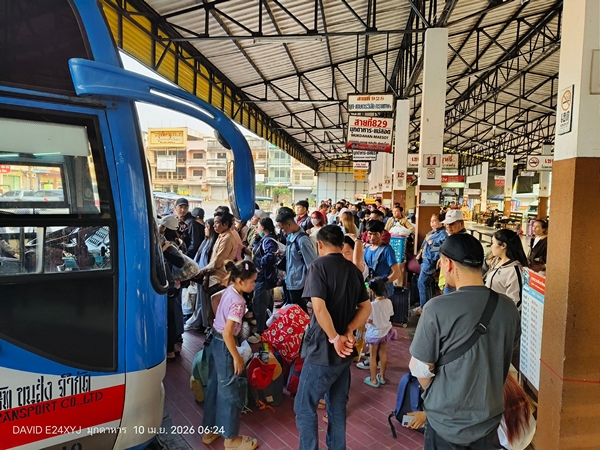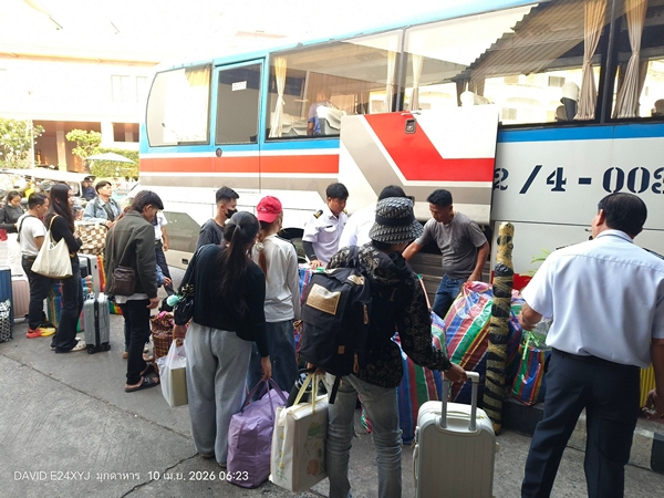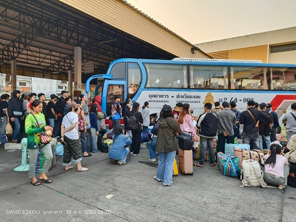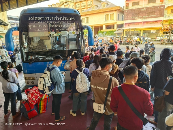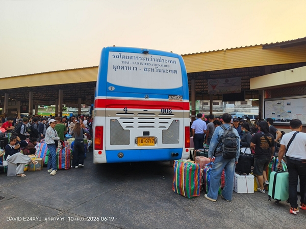 เมื่อวันที่ 10 เมษายน 2569 บรรยากาศที่สถานีขนส่งผู้โดยสารจังหวัดมุกดาหารเป็นไปอย่างคึกคัก ตั้งแต่เวลา 06.00 น. มีแรงงานชาว สปป.ลาว จำนวนนับพันคนเดินทางมาจากกรุงเทพฯ และพื้นที่ภาคตะวันออก เพื่อรอต่อรถโดยสารระหว่างประเทศมุกดาหาร – สะหวันนะเขต กลับไปเฉลองเทศกาลสงกรานต์กับครอบครัว พบสัมภาระยอดฮิต “ถุงสายรุ้ง” วางเรียงรายเต็มสถานี